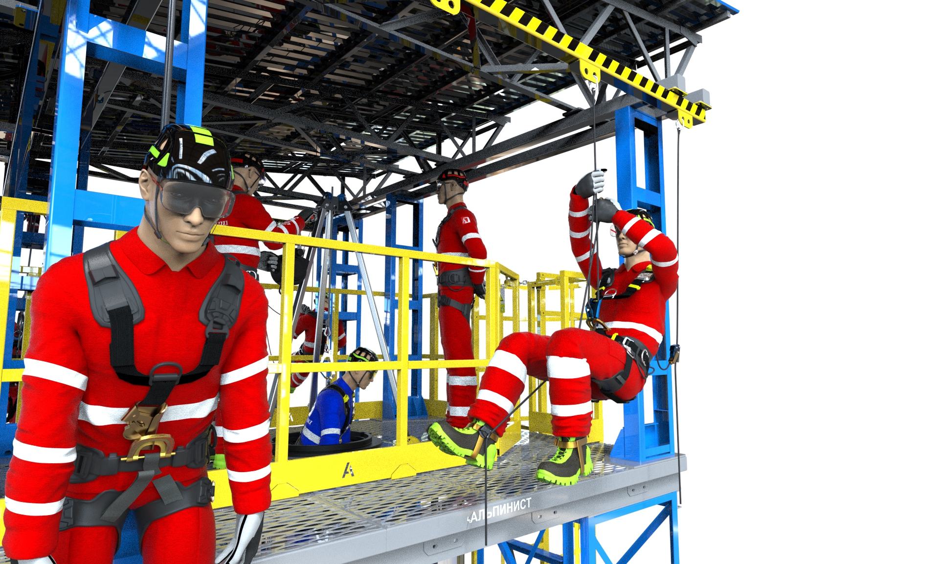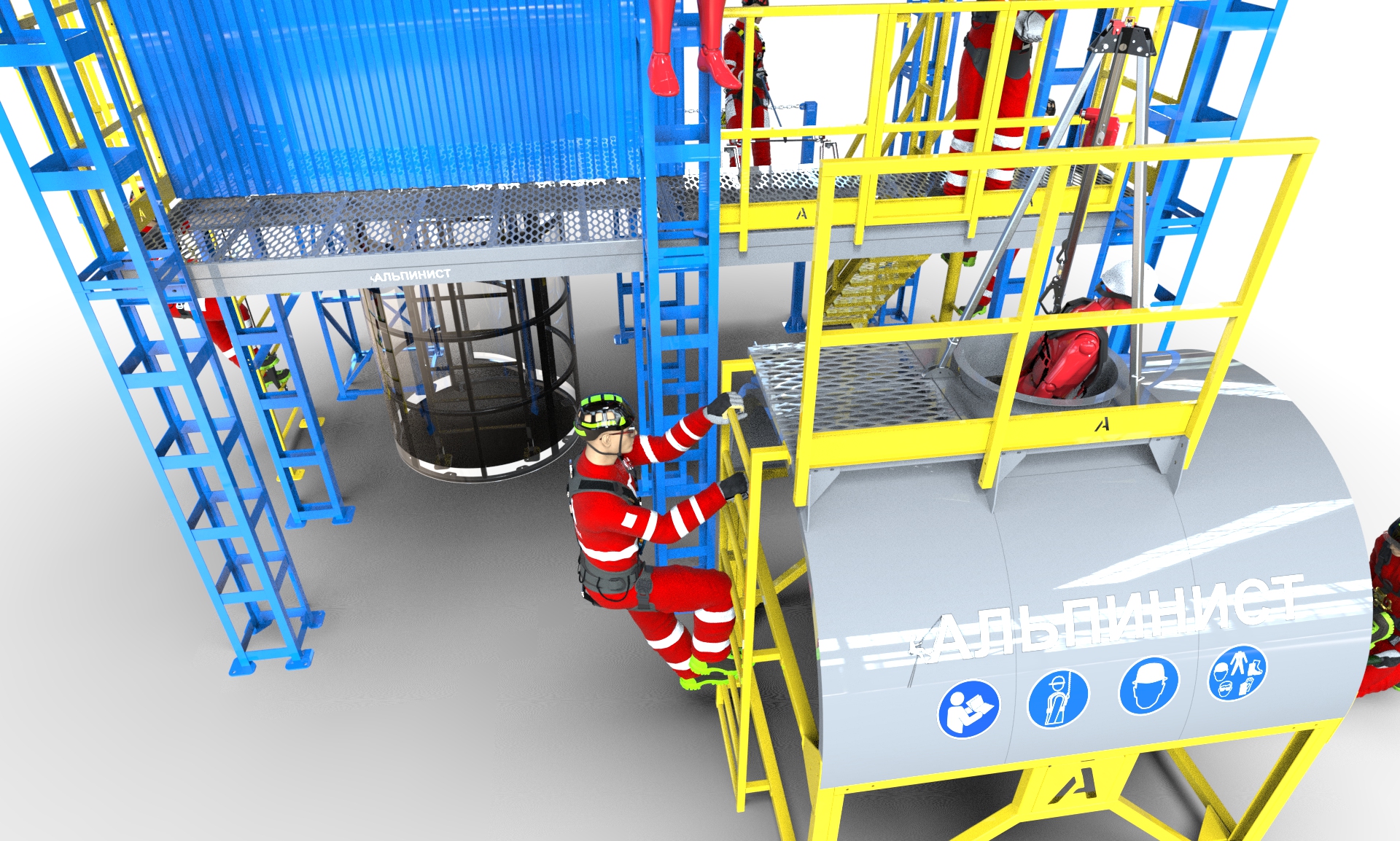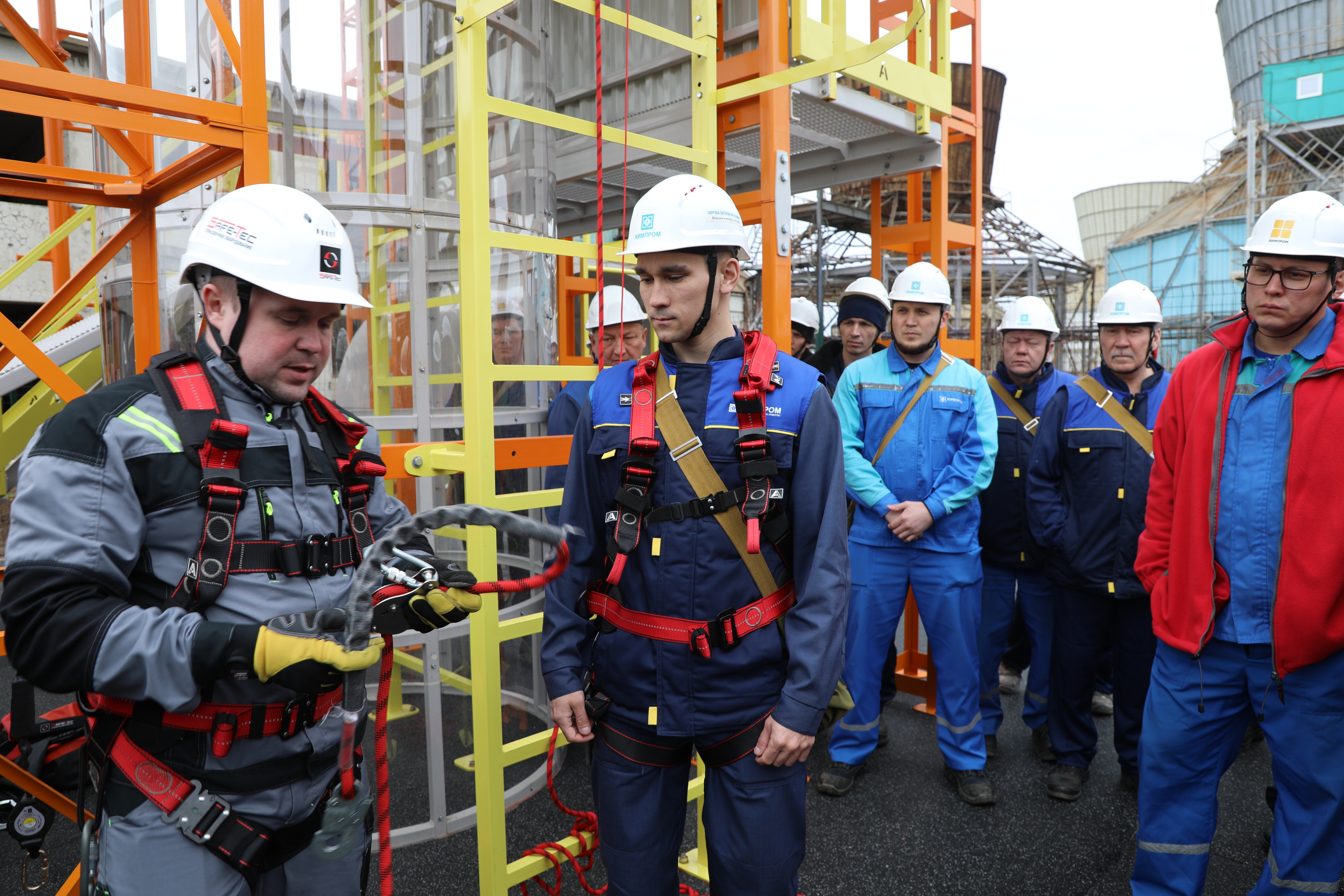 Масштабный комплексный тренажер успешно смонтирован и готов к занятиям – первая практическая демонстрация проведена для группы из 40 сотрудников, ответственных за организацию и проведение работ на высоте. Тренажер позволяет моделировать сложные условия проведения работ, а также отрабатывать применение средств индивидуальной защиты, систем крепления и страховки.